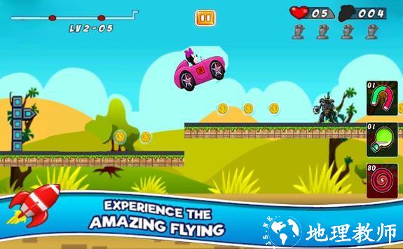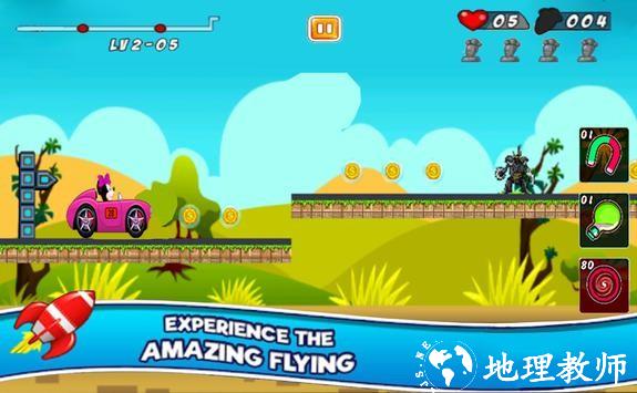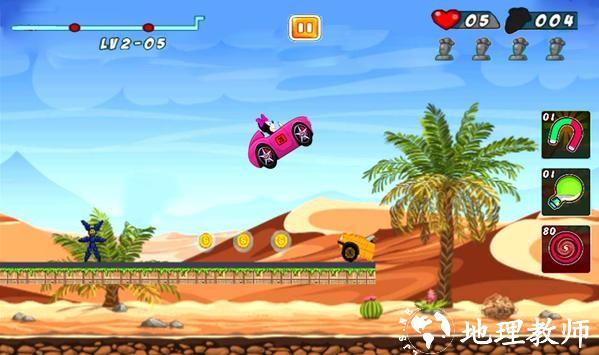 1.玩家可以在各个场景关卡中控制小车前进,沿途收集金币和道具,让你跑得更快;