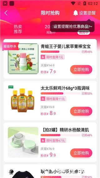 4、高频促销活动:设有红包福利专场、每日神券、9.9 元精品屋、限时抢购等频道,每天更新 100 款新品,确保低价好货;