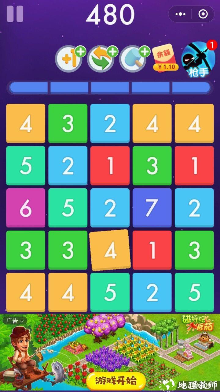 2. 消除方块:当相同数字的方块达到3个或更多时,它们会被消除,并产生新的数字方块。
