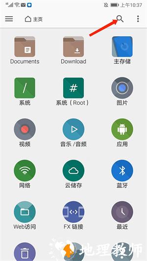 1、打开 FX 文件管理器中文版,进入应用主界面,点击右上角【放大镜】图标,可输入文本并添加地点、种类、日期尺寸等条件,搜索当前设备的文件和文件夹。