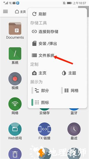 2、返回主界面,点击右上角【三个点】图标,弹出包含刷新、连接到存储等功能的菜单窗口,此处以选择【文件系统】为例。