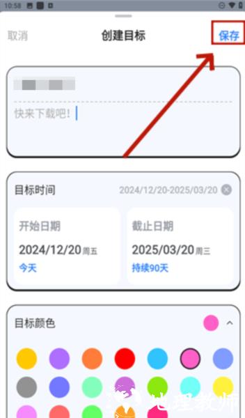 2、用户能够为自己想要创建的目标填写名称,并写一句鼓励自己的话。还可以设置目标的时间,目标的颜色等。