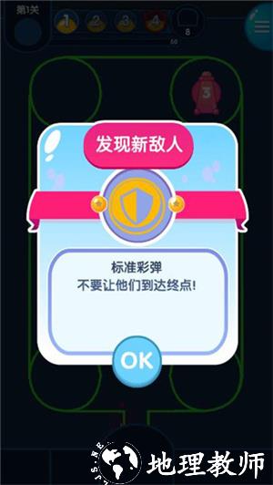 《喷射塔防》是一款融合涂鸦艺术与策略塔防的休闲手游,用色彩鲜明的卡通画风构建战场,玩家需部署不同颜色的喷射炮塔,通过合成升级、策略布阵来抵御源源不断的泡泡怪兽入侵。相同颜色的炮塔通过数字相加合成高阶塔,提升攻击力,元素互动机制丰富了战术维度。