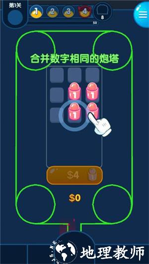 2、将数字和颜色相同的炮塔进行合成。