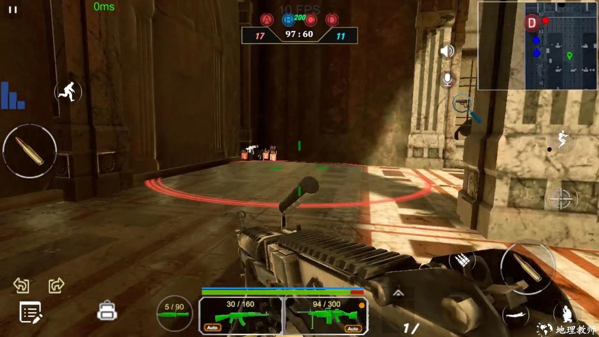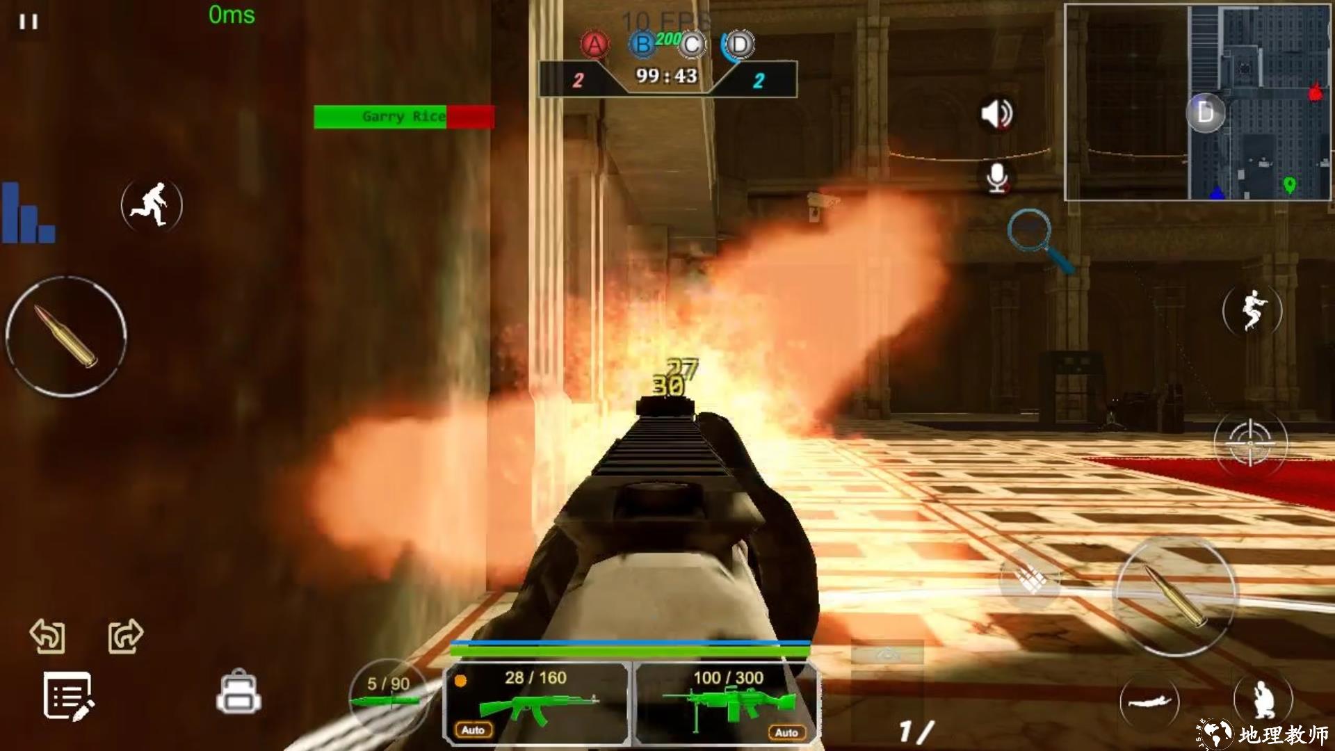 3. 选择心仪的地图开始游戏,通过虚拟键盘控制角色移动,右下方多功能按钮进行射击、投掷手雷等操作。