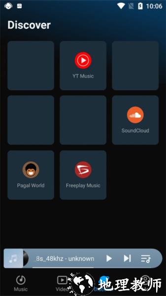 我们进入app当中,软件目前还不支持中文,默认英文,不过里面的操作并不难,和大家平时用的音乐播放器差不多, 当我们刚进入到软件共有四个板块,音乐、视频、发现、我的。