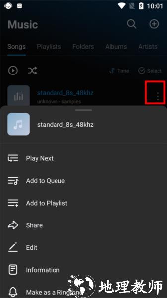 ②随意选择一首歌曲旁边的三点图标,在这里大家可以切换下一首、添加到播放列表、删除、设置为铃声等操作;