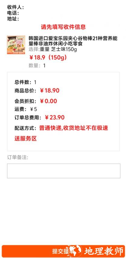 3、在支付界面中,填写或选择收货地址信息(若未保存地址,需完整填写收件人、电话、详细地址等内容),确认信息无误后,点击 “提交订单”,选择合适的支付方式完成付款,即可成功购买商品。