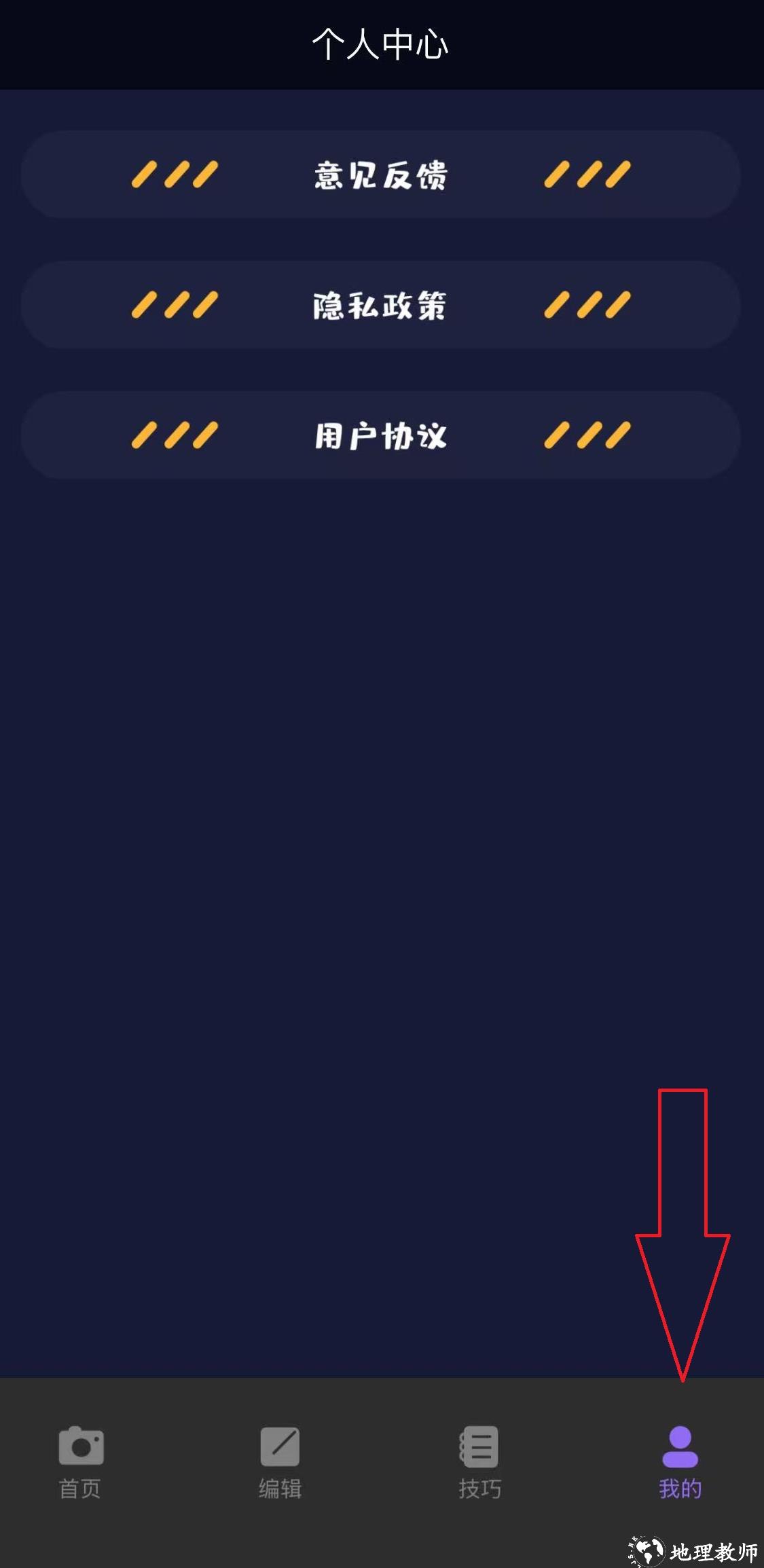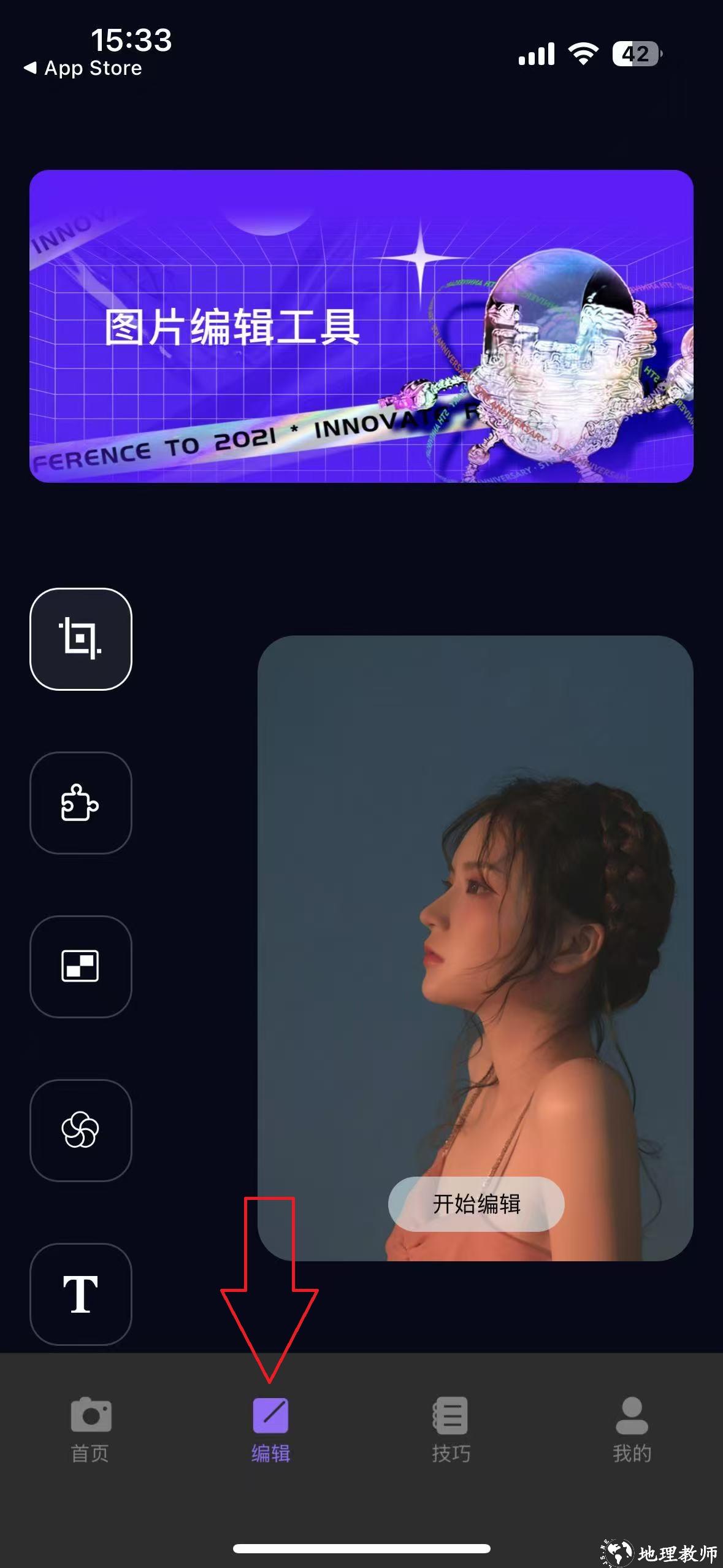 底部有导航栏:首页、编辑、技巧、我的。