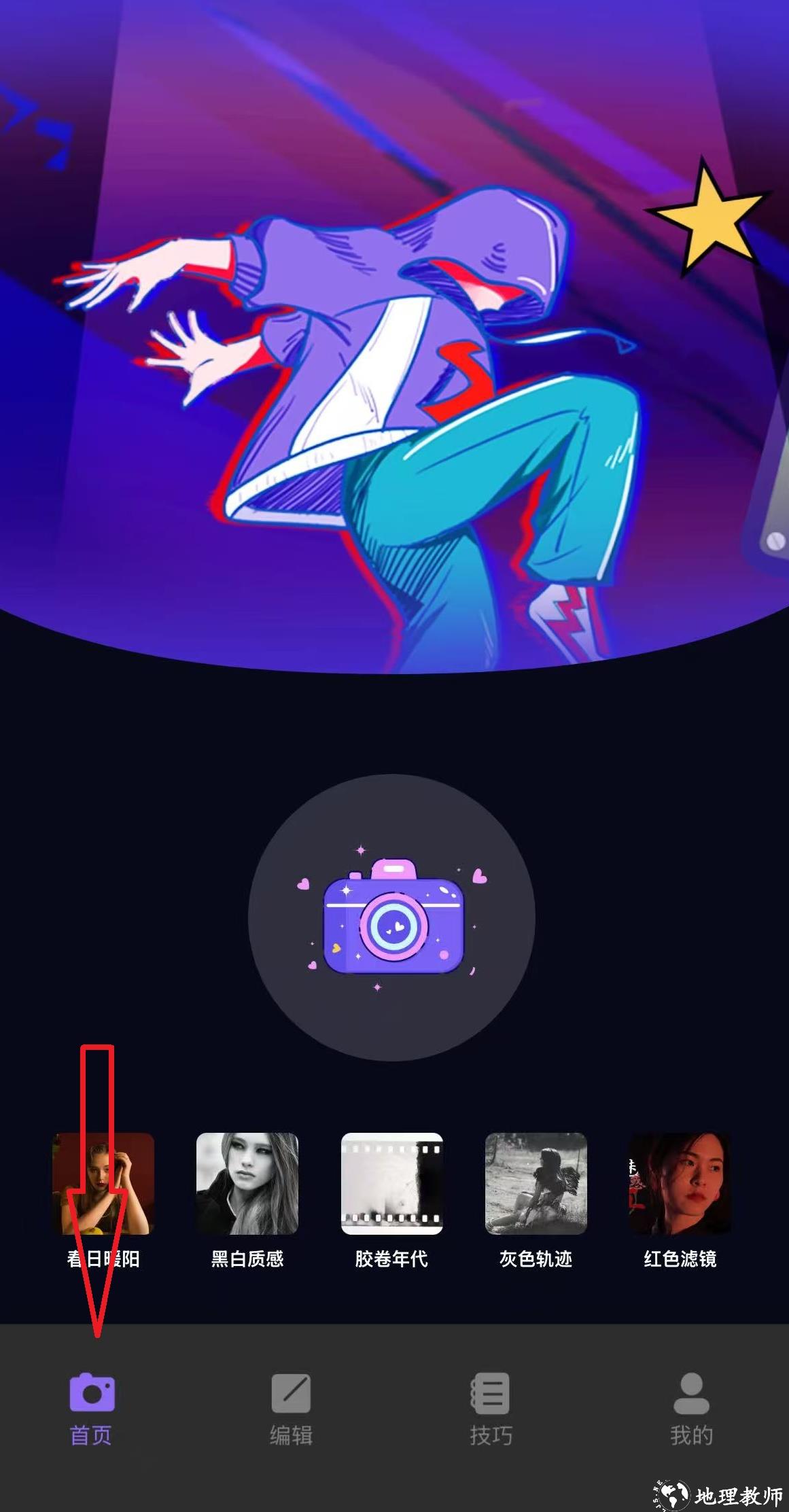 功能概述:首页展示了多种滤镜风格,方便用户快速选择并使用。