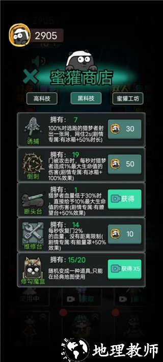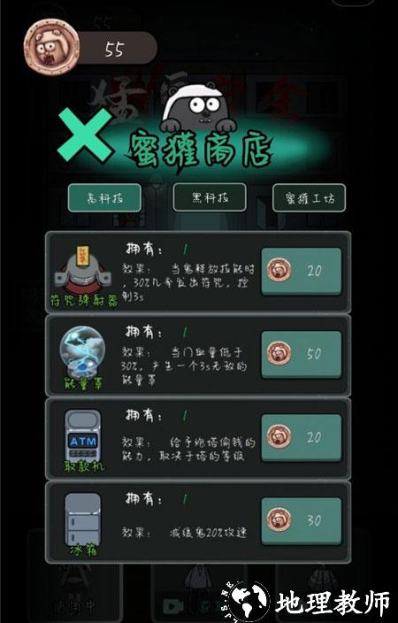 到蜜罐商店去购买道具,必买道具就是黑科技里的维修台和能量罩,维修台+能量罩,维修台增加50%的效果,其他选择关卡需要的进行购买,注意商城有可以通过观看视频获取房门升级卡,还有修勾魔盒(可以随机变成一种道具在剧情中使用,也可以用来免费升级炮塔)。