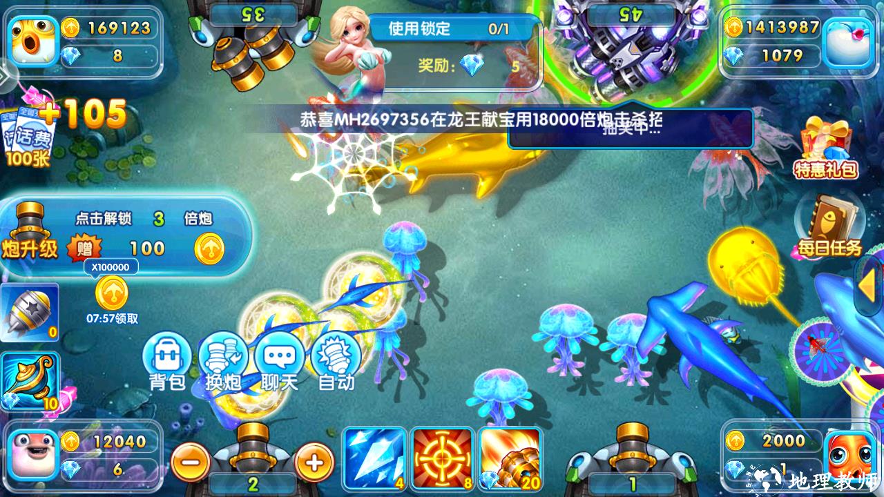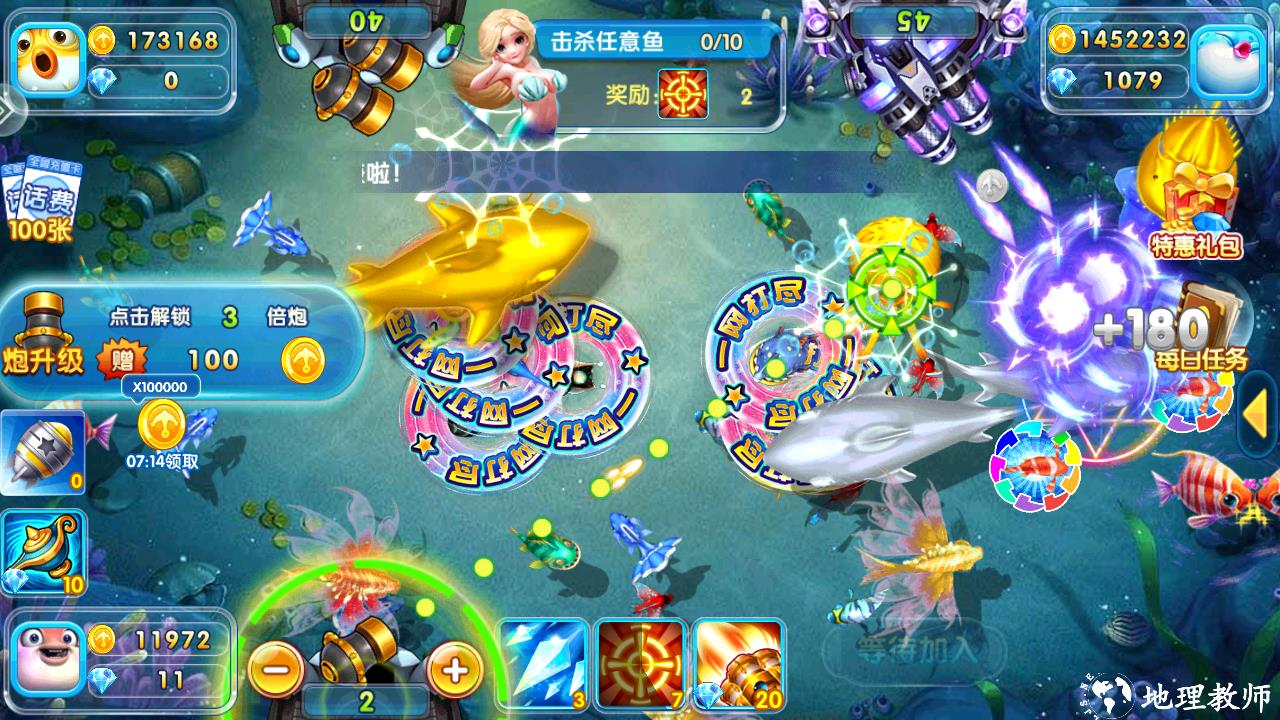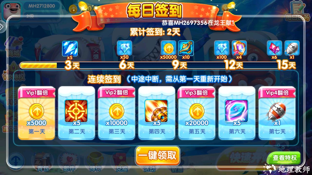 1、每日赠送海量金币与 VIP 独家礼包,捕鱼过程中还有机会获得电话费奖励,可与百万群体共同探索神秘海洋。