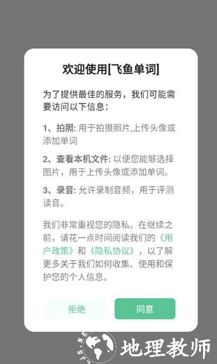 1、打开飞鱼单词 APP,首次使用需阅读并同意用户政策与隐私协议,完成基础权限确认后进入主界面。
