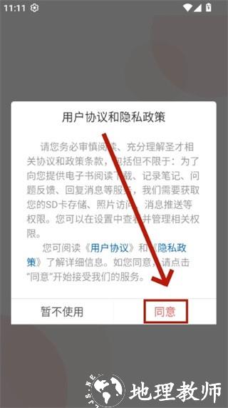 1、打开大学生英语竞赛圣题库 APP,首次启动时会弹出软件协议与权限提示框,仔细阅读后点击 “同意”,完成基础权限授权。