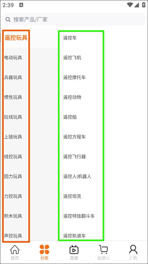 2、在首页顶部功能区找到并点击 “分类” 选项,进入商品分类界面,系统按 “大类 + 小类” 双层结构划分商品(如红色方框标注的 “益智玩具” 大类,绿色方框标注的 “拼图积木” 小类)。
