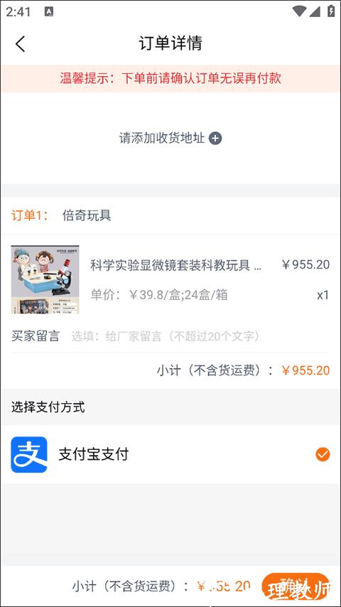 6、在订单详情界面填写收货地址,核对商品型号、数量及总价,选择线上付款方式;确认无误后点击 “确认下单”,完成支付即生成订单。