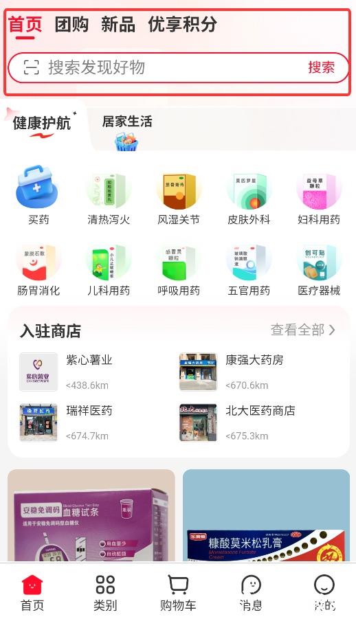 2、首页提供团购活动、新品推荐及积分兑换入口,支持关键词搜索商品。