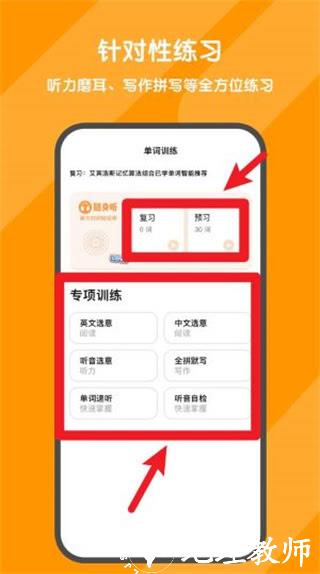 4、从首页进入单词训练中心,可选择预习或复习不同模式。左右滑动界面可发现专项训练区,提供针对性强化练习。