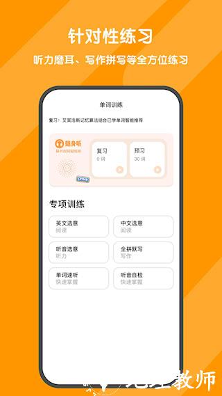 8、设计多样化训练题型,包含听说读写全方位练习。支持自选英/听音辨义等七种模式,巩固记忆成果。