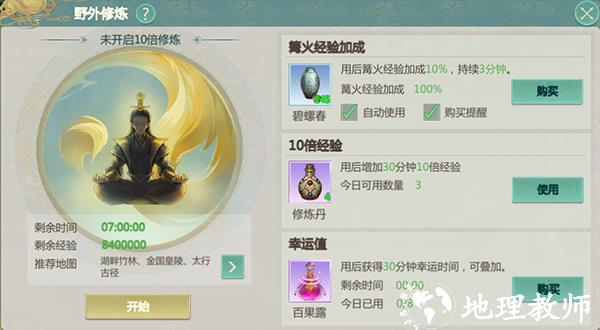 每天可免费获得1小时十倍修炼时间,使用修炼丹可增加半小时十倍修炼时间。