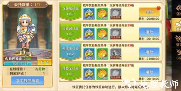 2、15级开启铁匠任务后,委托任务记得及时接取并按时领取,获得的SP点可以增加强化G化成功率,还能增加分解时获得稀有道具的几率,早学早享受~
