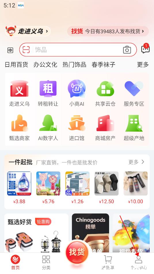 1、打开小商品城 APP,进入主界面后,点击右下角的 “我的” 按钮,进入个人中心页面。