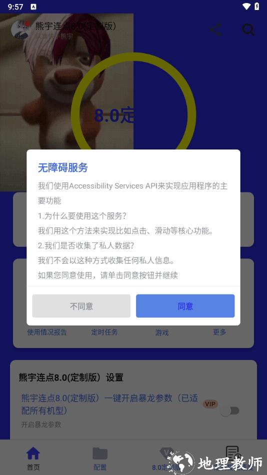 1、打开熊宇连点器软件,点击同意并开启所需权限,完成基础设置。