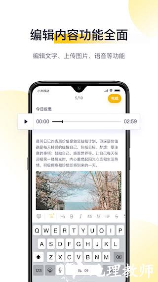 3、多媒体富文本编辑:支持在日记中不限量地插入照片和录音。同时可以设定字体样式,并插入地点、天气、步数等多种日常辅助数据,丰富记录形式。
