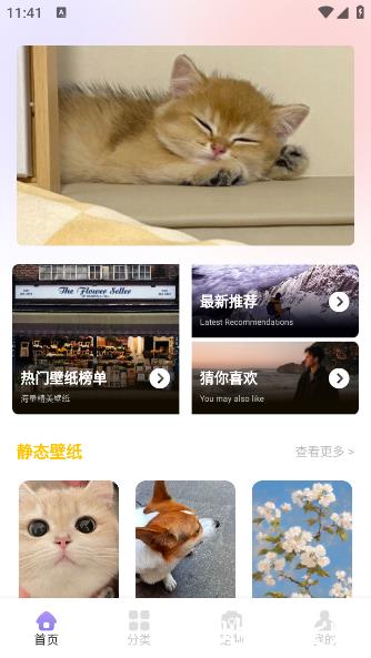 3、分类页面将壁纸细致归类,包含风景类、宠物类、明星类等不同类别。