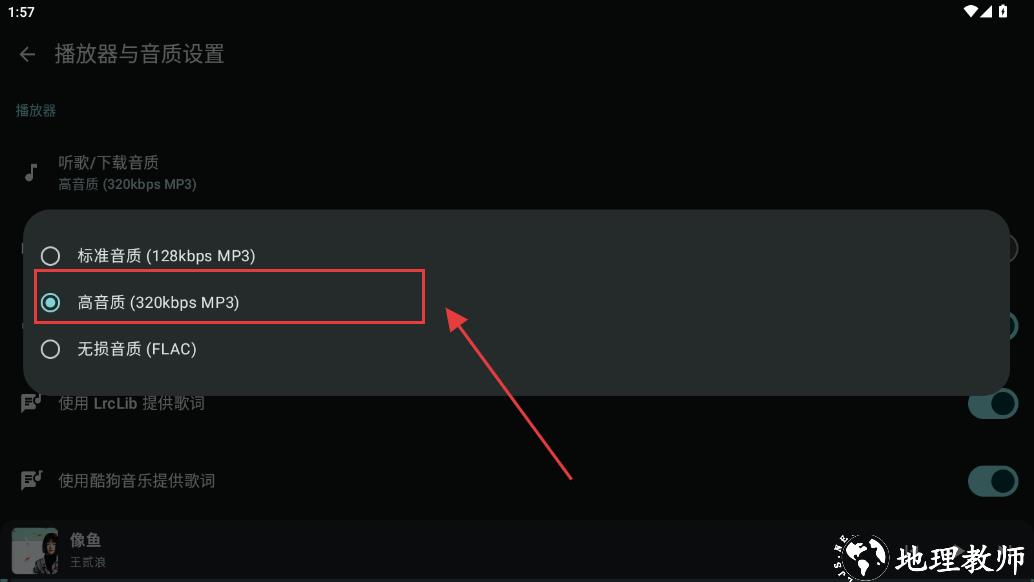 4、根据需求选择对应音质,软件支持标准 MP3 及无损 FLAC 等格式,默认多为高音质。