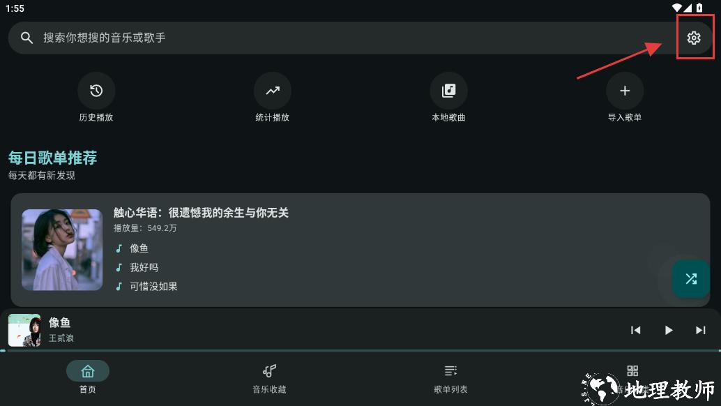 1、打开冬瓜音乐 APP,在首页找到搜索框右侧的设置图标并点击,进入设置界面。