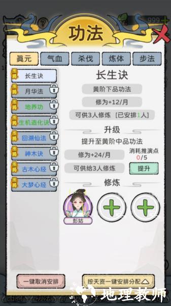 1、功法先升满一个再升下一个(年长的就会越强)前期装备加成不大所以,以年龄分配资源包括修炼功法。