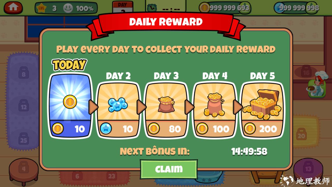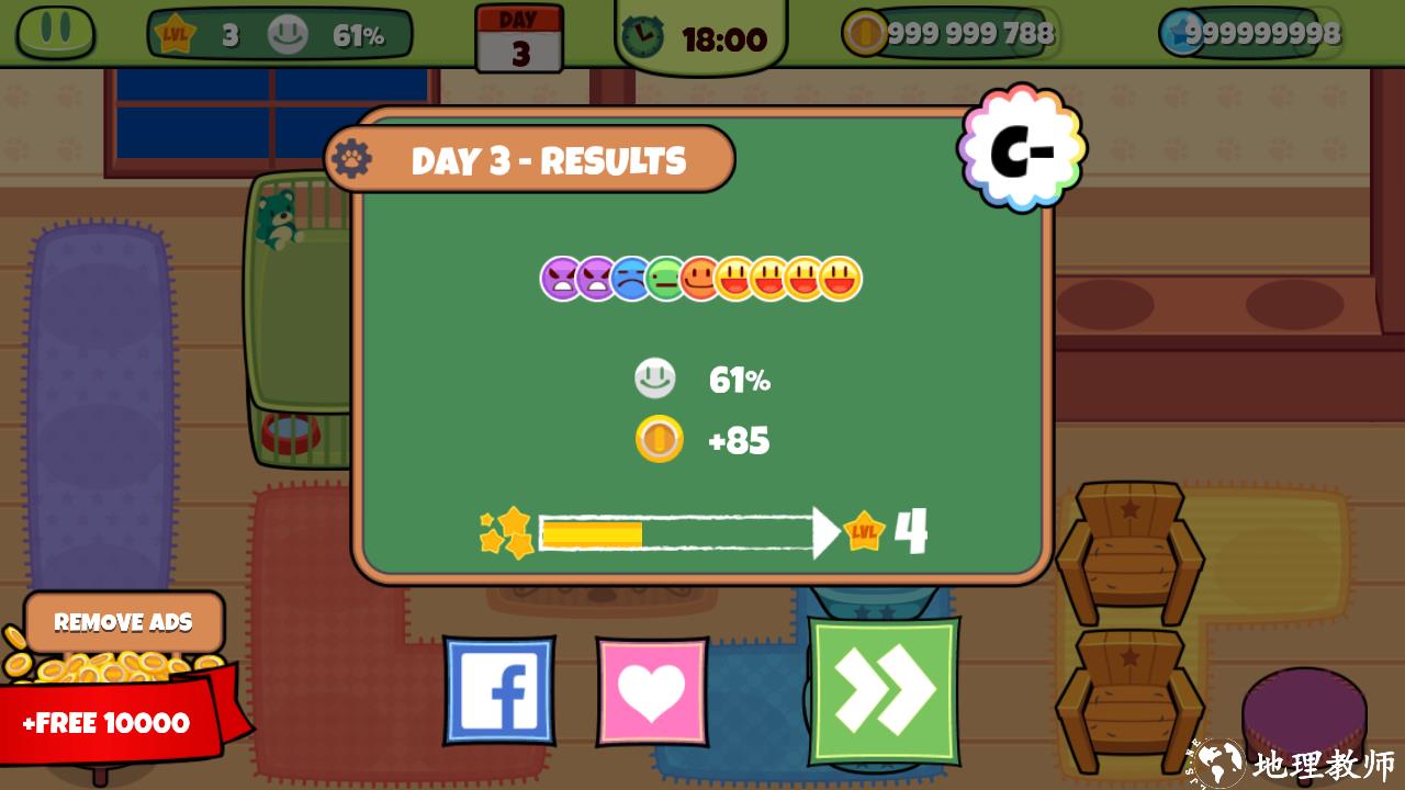 7、完成第一天的店铺经营后,系统会生成总结页面,展示当日收入与服务评价。