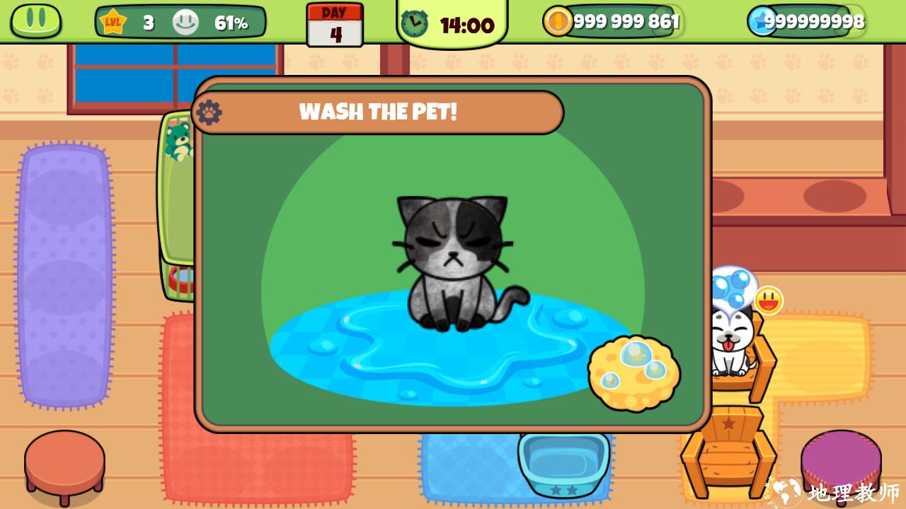1、洗宠物:获取海绵与洗发水道具,通过操作清洁脏污的宠物,恢复其干净状态。
