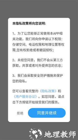 1、打开智途实况语音导航 APP,仔细阅读隐私政策与服务协议后,点击同意并继续。
