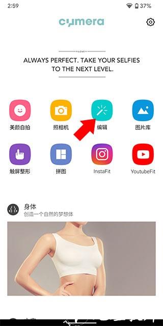 1、下载并打开Cymera特效相机,来到下方主界面点击编辑按钮