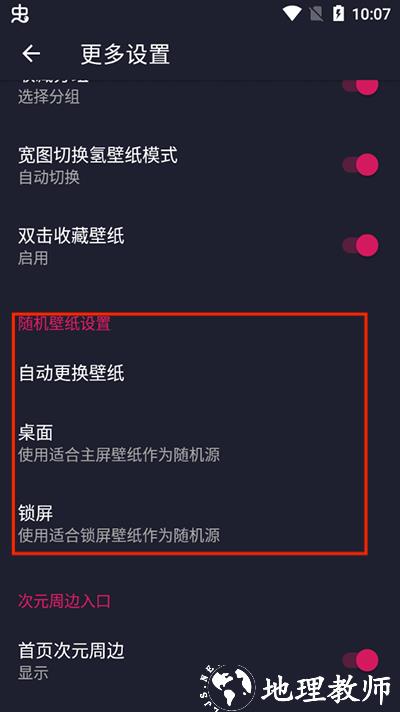 3、在更多配置中,找到随机背景设置,提供桌面、锁屏和自动更换三种选项用于设置随机背景。