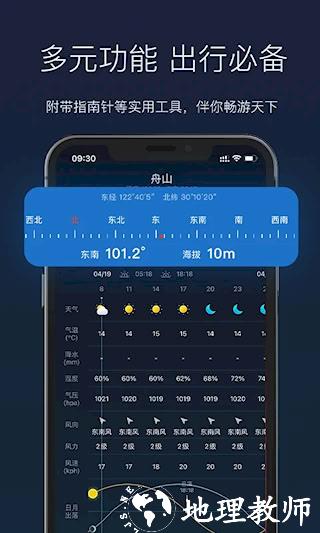 4、集成电子指南针、日出日落时间、潮汐查询等户外实用工具。提供全球经纬度定位与海拔测量功能,支持位置坐标分享。