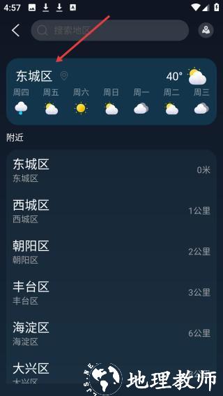 2、 在地区选择页面默认显示东城区天气,提供未来多日天气预报详情。下方列表展示周边城区名称及直线距离,方便快速切换关注区域。