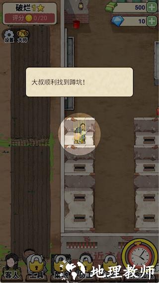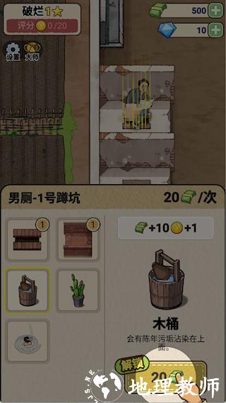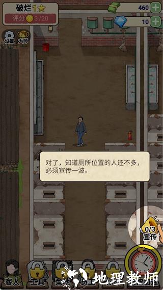 1、设施修缮升级:开局修复破损设施,如门板、水龙头等,随资金增加,将蹲便器升级为坐便器,安装自动感应洗手设备提升顾客满意度。