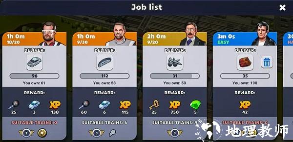 游戏为您提供任务,或者称之为“工作”。基本上你必须向他们提供一定数量的某种商品。没有时间限制,但有些工作需要某种类型的机车。您可以在上面的屏幕截图中看到,一些工作没有“合适的火车”,这意味着我没有任何合适类型的免费机车(史诗)。