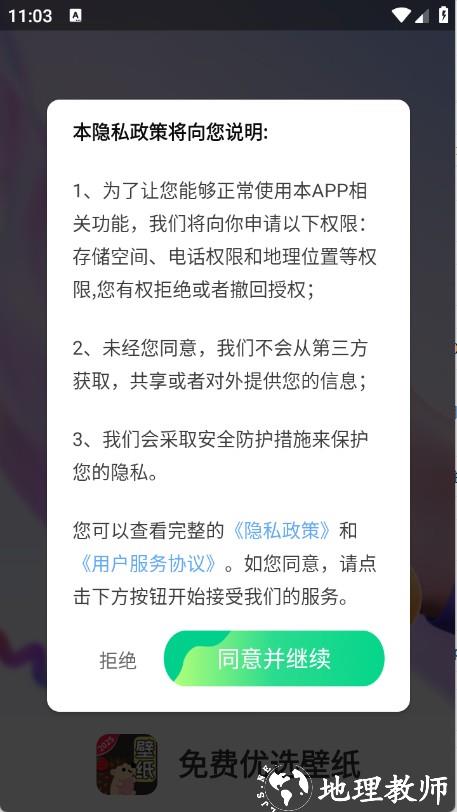 1、首先在本站下载免费优选壁纸,完成安装后打开软件,同意隐私政策与用户协议。