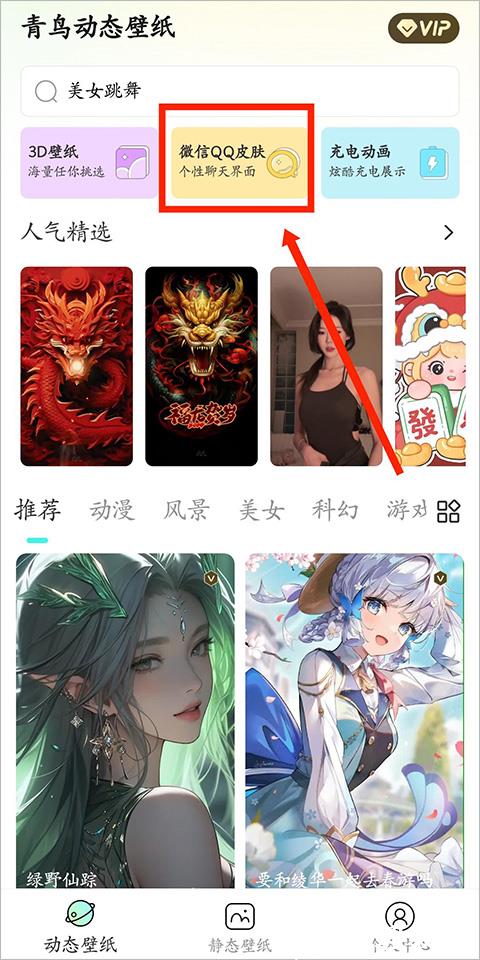 1、打开青鸟动态壁纸 App,进入首页后,找到【QQ 微信皮肤】选项并点击打开。