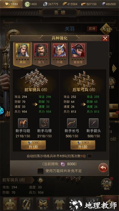 消耗军械碎片可以快速提高士兵属性,也是前期主要的提升途径;