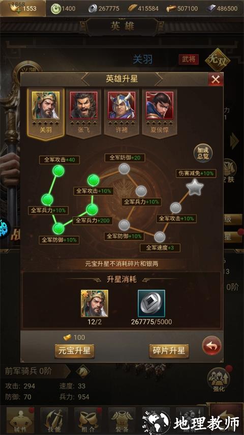 英雄升星可以提供前中期重要的百分比攻防和减伤属性,升星消耗同名英雄碎片;
