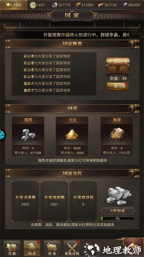 年度的杀敌数、战损数与建设值影响国家分红可领取的奖励倍数;