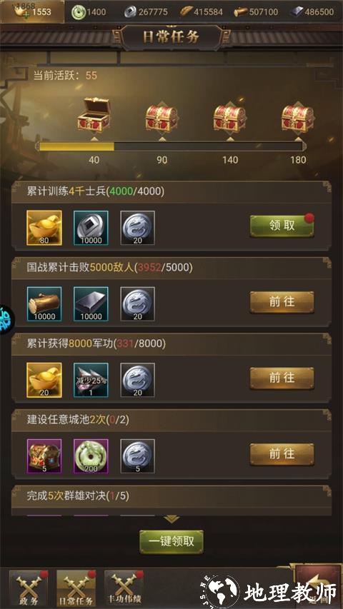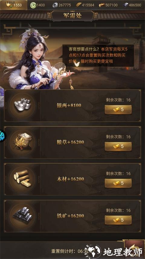 5.军资商店:军资在组队讨伐里获得,按自己的需求选择购买,建议购买急行方便加速行军