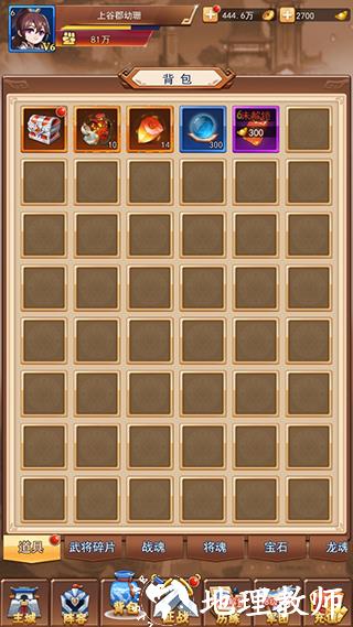 3、然后就是背包,背包中可以用来存放装备和武将的碎片还有一些用于升级的道具。背包存放有上限,各位小伙伴要记得及时清理噢,多余的装备可以回收为金币,溢出的武将碎片也可转化为别的武将碎片