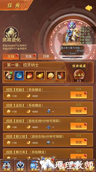 玩家在征战页面可以点击左下方的任务进入任务页面,并且领取已完成任务的奖励,有主线、支线日常三个任务板块可以完成。