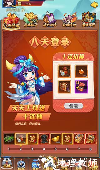 玩家在主城,点击上方的热门活动,即可进入八日登录页面,每日登录都可以领取丰富的奖励,更有神秘神将相送。